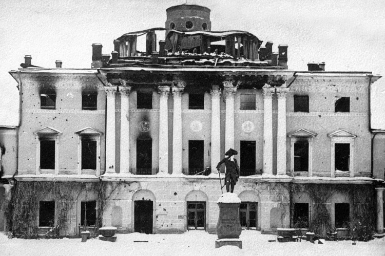 Фото: Разрушенная фашистскими вандалами центральная часть фасада Большого Павловского дворца. Всеволод Тарасевич/РИА Новости
