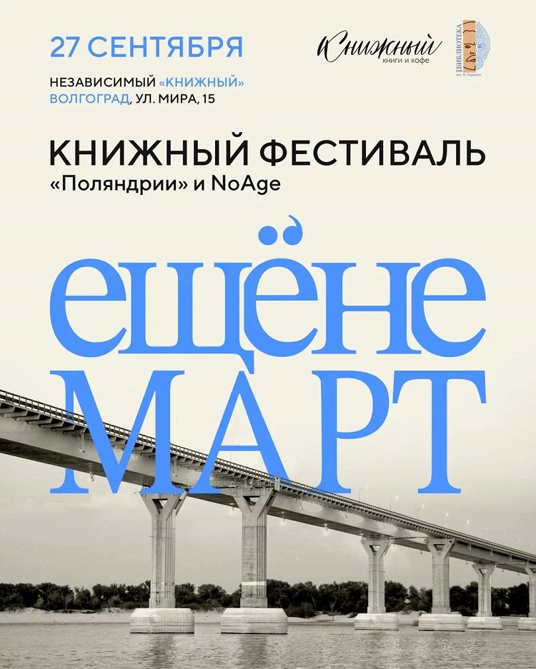 27 сентября в Волгограде пройдет книжный фестиваль «ЕщеНеМарт». Город станет девятым (после Новосибирска, Хабаровска, Калининграда, Екатеринбурга, Краснодара, Иркутска, Тюмени и Красноярска) городом, где пройдет фестиваль, организатором которого являются издательства «Поляндрия» и NoAge.