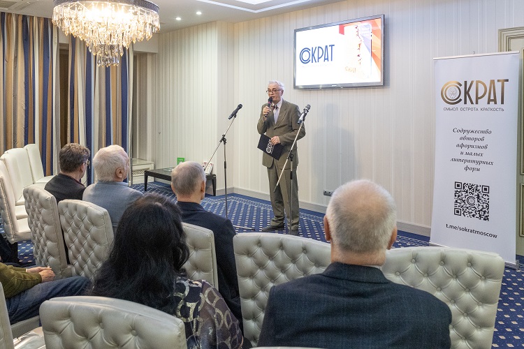 Вторая часть презентации была посвящена представлению альманаха «Сократ-25. Афоризмы. Юмор. Карикатуры», выпущенного издательством «Вече» по итогам Премии «Афорист года – 2024» и книг лауреатов Премии за 2024 г. – Владимира Колечицкого «Мысли с ограниченной ответственностью» и Владимира Кисмерёшкина «Слова внезапно прописались».