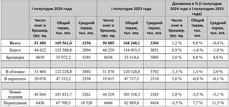 По данным комплекса «Российская книжная палата» РГБ, выпуск книг и брошюр за I полугодие 2024 года составил 51 480 названий, что на 1,2 % выше данного показателя за аналогичный период 2023 года. Совокупный тираж – 169,6 млн экземпляров, это на 0,8 % выше, чем за шесть месяцев 2023 года. Средний тираж – 3294 экз., что на 0,4 % ниже уровня 2023 года.