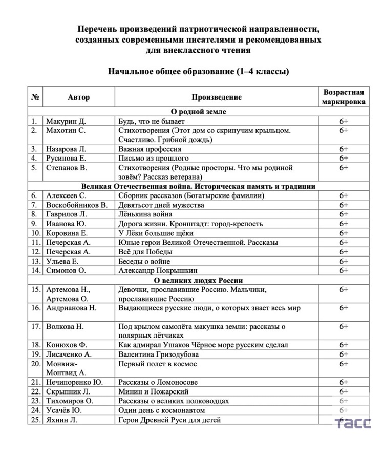 Минпросвещения РФ составило перечень произведений патриотической направленности, созданных современными писателями и рекомендованных для внеклассного чтения. Этот документ предоставили ТАСС в ведомстве.
