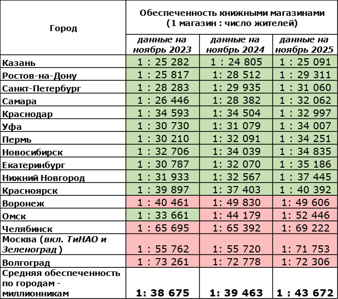 В городах-миллионниках на сегодняшний день насчитывается 821 книжный магазин, на ноябрь 2024 года эта цифра составляла 903. Из общего количества закрытых в стране книжных магазинов (338 объектов) 39,1% пришлось на города-миллионники. Количество закрытых книготорговых точек в 16 городах с населением свыше 1 млн жителей составило 132, тогда как открыты за прошедший год 50 книжных магазинов.