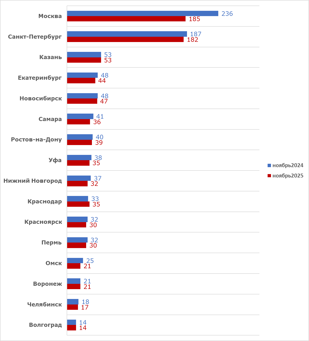 За период с ноября 2024 по ноябрь 2025 гг. в городах с населением свыше 100 тыс. человек были закрыты 338 книжных магазинов и 135 открыты. В прошлом году (с ноября 2023 по ноябрь 2024 гг.) были закрыты 220 магазинов и 137 открыты.